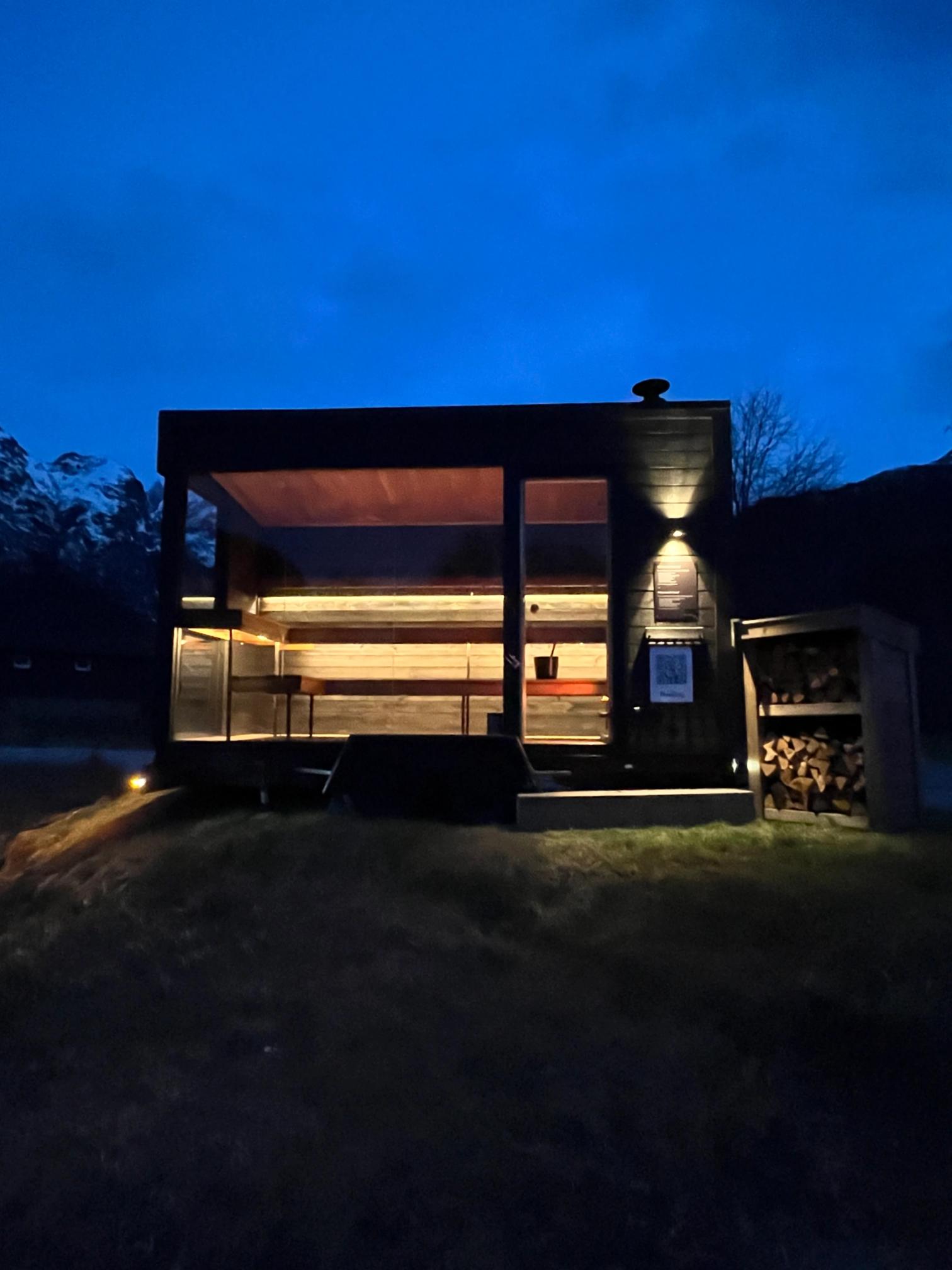 Badstuen er utstyrt med behagelig belysning og har plass til opptil 10 personer, perfekt for både små grupper og de som ønsker en stille stund for seg selv.